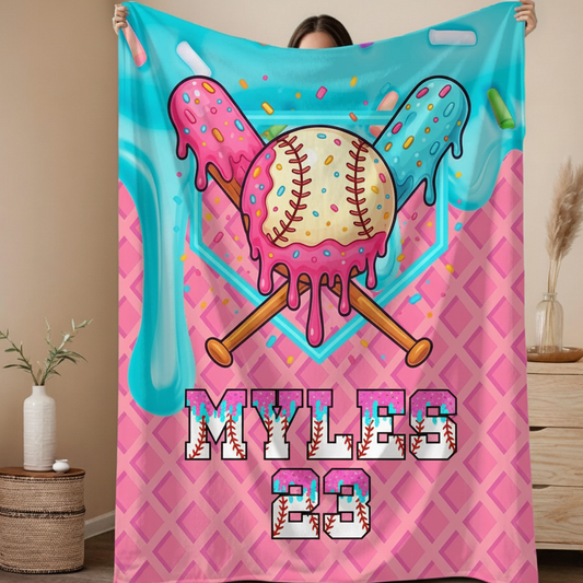 Personalized Ice Cream Drip Baseball Blanket – Custom Name Kids Baseball Throw, Player Gift & Birthday Gift for Boys