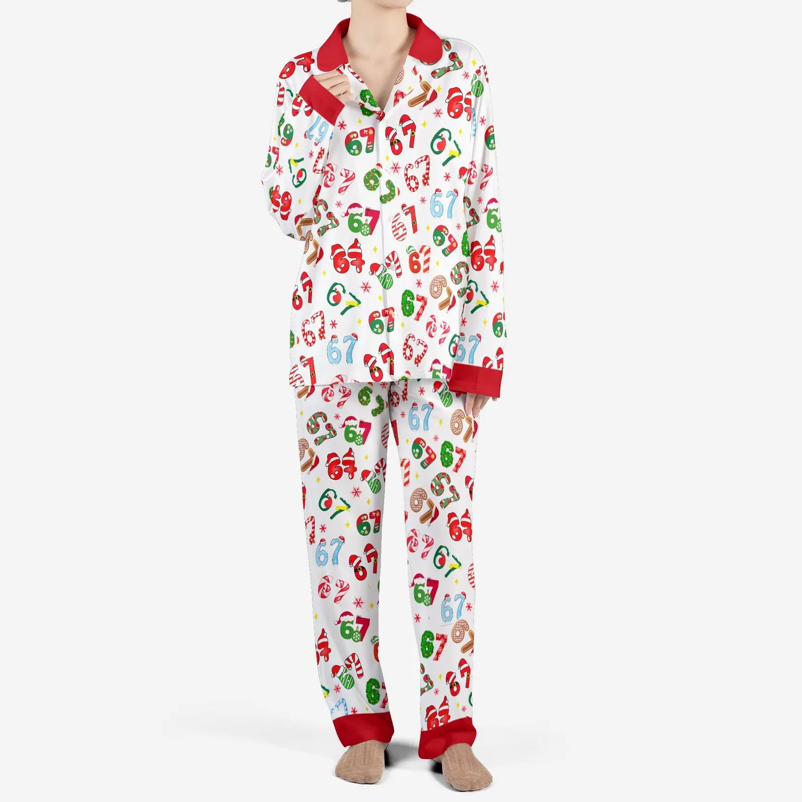 67 Christmas Pajama Set – Long Sleeve Cartoon Print Holiday Sleepwear, Soft Cozy Pants Outfit, Unique Six Seven Design Gift
