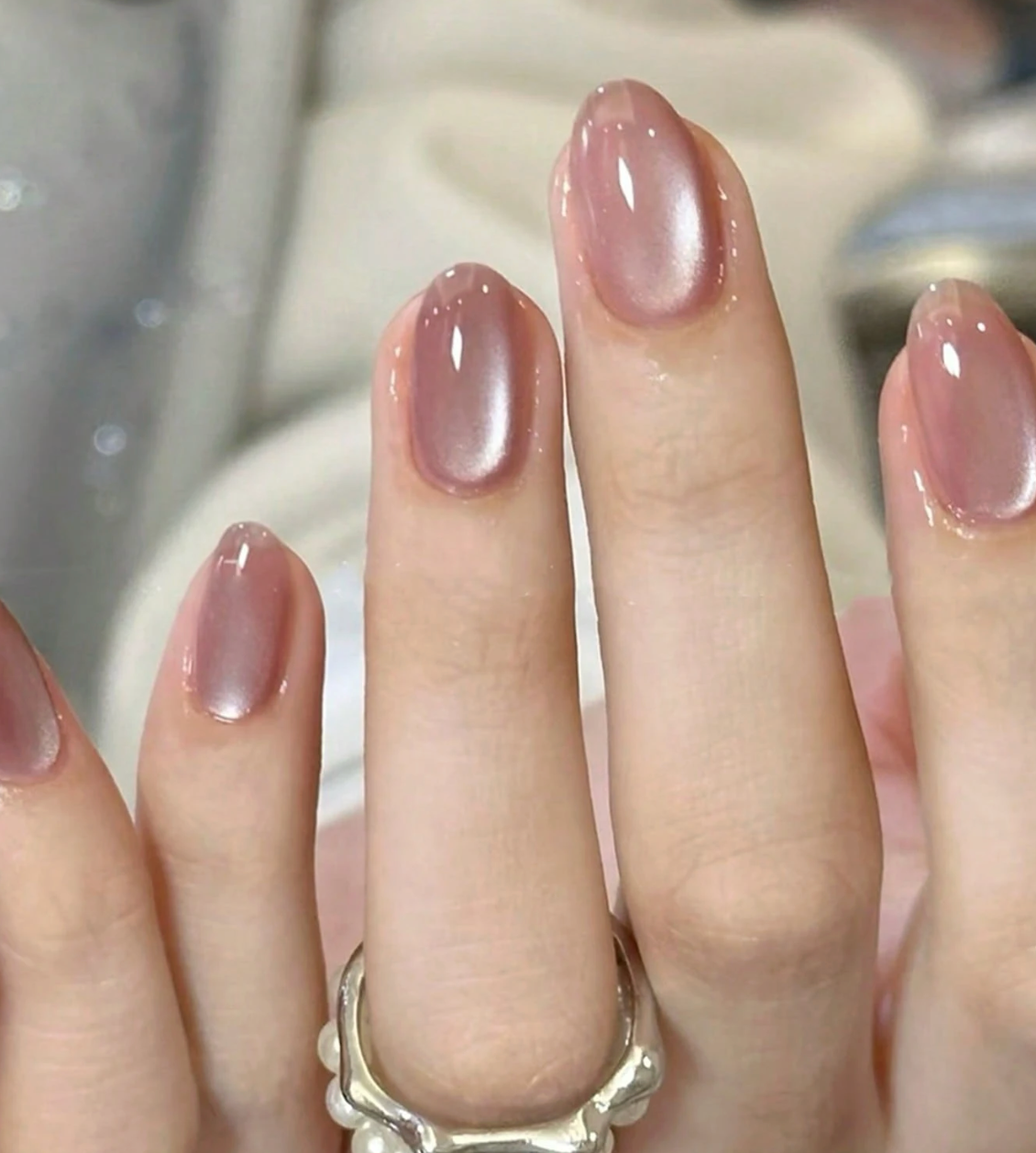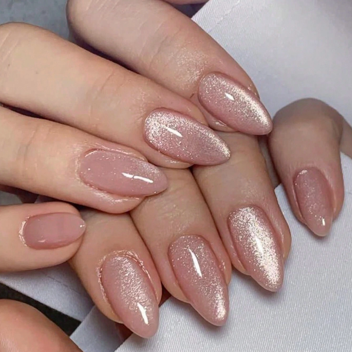 Create a clean modern look with these neutral short square press on nails featuring a soft green cat eye finish.