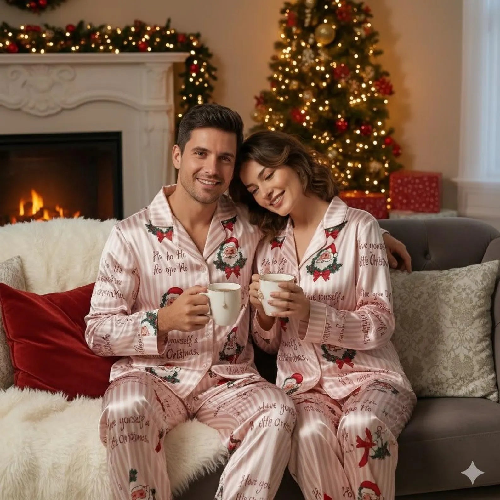 These satin Christmas pajamas blend festive stripes, soft satin comfort, and a touch of Santa charm for the coziest winter nights.