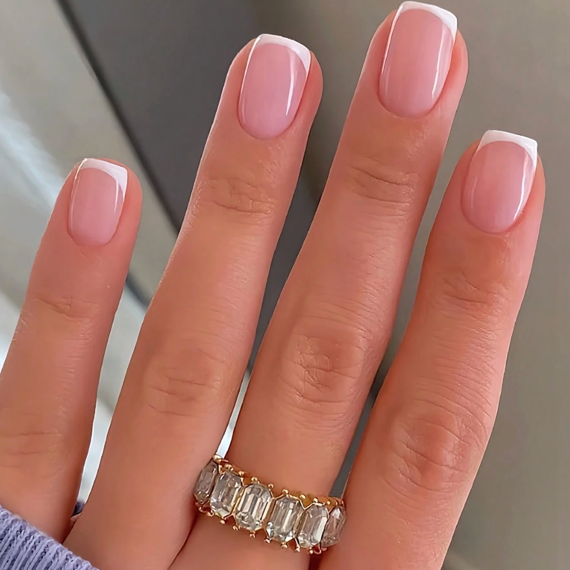 Create a sweet clean look with these short square press on gel nails featuring a soft pink base and semi transparent French manicure style.